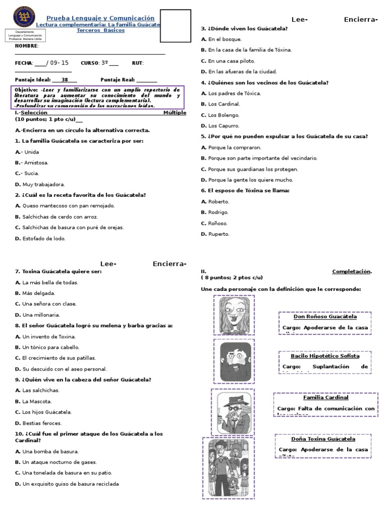 Evaluación de lectura complementaria la familia guácatela nombre luisa san martin p.